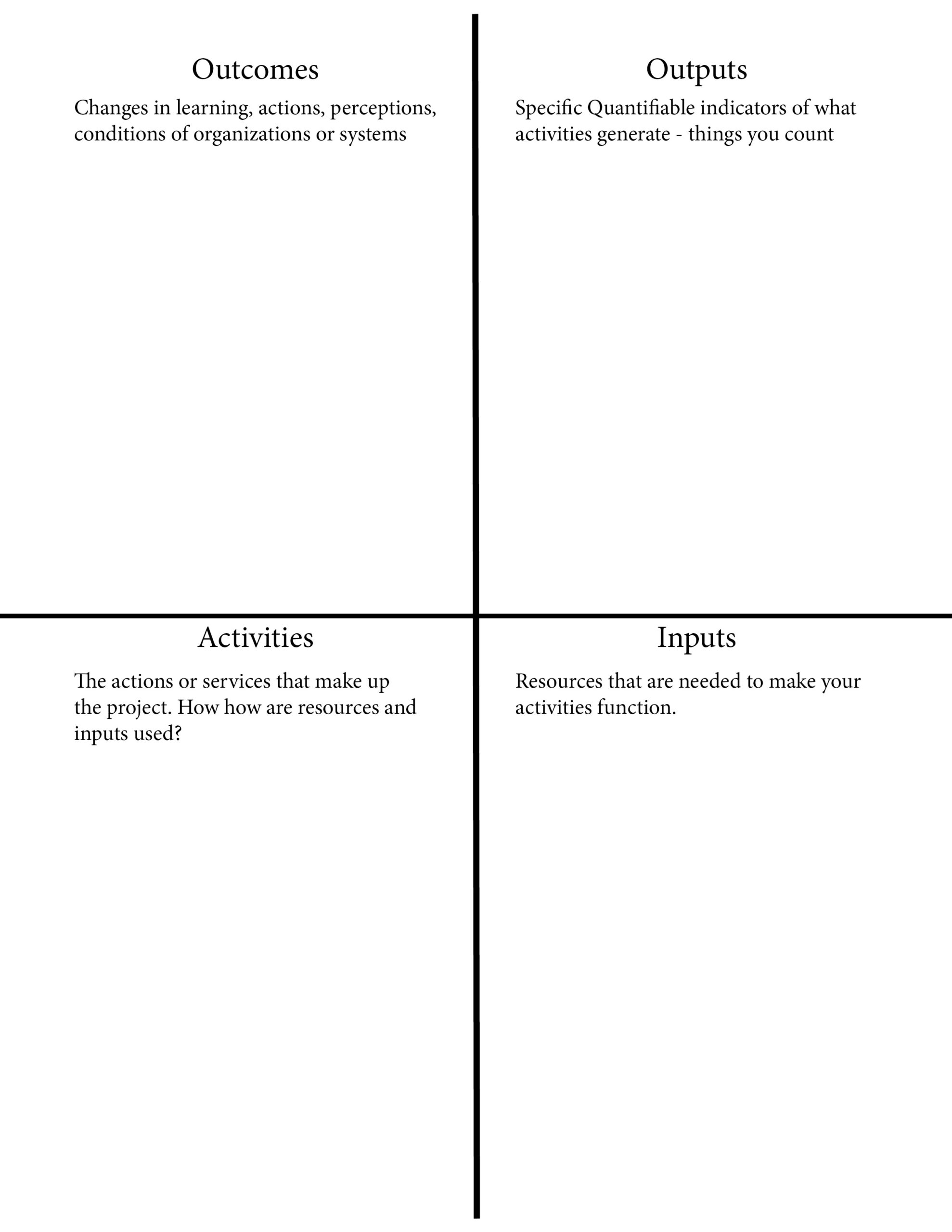 We use Logic Models as a way to focus our conversations and get on the same page about what we're trying to do with a project or event. We start with outcomes and move around the sheet in a clockwise direction.